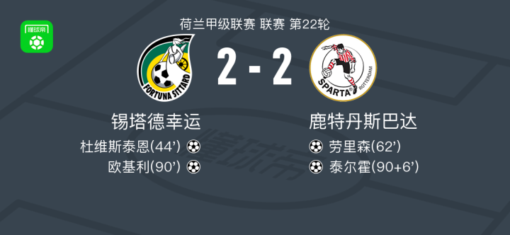 北京时间2月8日荷兰甲级联赛 联赛 第22轮,锡塔德幸运主场对阵鹿特丹斯巴达。锡塔德幸运杜维斯泰恩破门,欧基利破门。鹿特丹斯巴达劳里森破门,泰尔霍破门。最终比分锡塔德幸运 2-2 鹿特丹斯巴达。