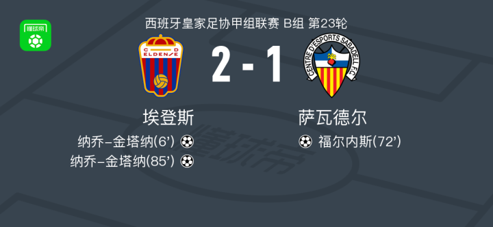 北京时间2月8日西班牙皇家足协甲组联赛 B组 第23轮,埃登斯主场对阵萨瓦德尔。埃登斯纳乔-金塔纳梅开二度。萨瓦德尔福尔内斯破门。最终比分埃登斯 2-1 萨瓦德尔。