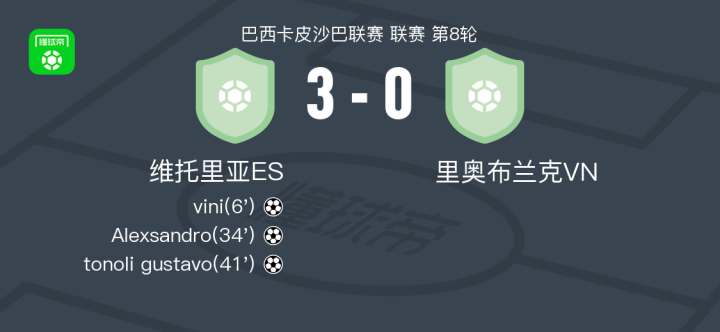 北京时间2月8日巴西卡皮沙巴联赛 联赛 第8轮,维托里亚ES对阵里奥布兰克VN。维托里亚ESvini破门,Alexsandro破门,tonoli gustavo破门。最终比分维托里亚ES 3-0 里奥布兰克VN。