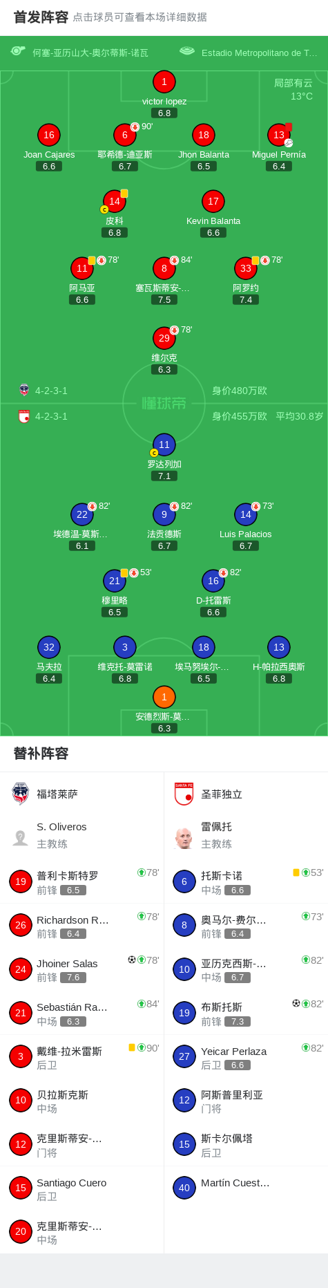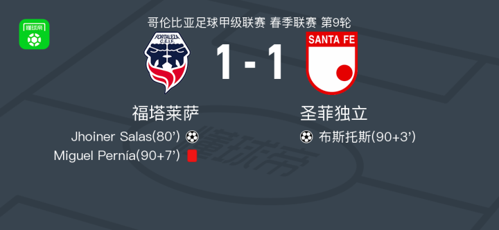 北京时间2月8日哥伦比亚足球甲级联赛 春季联赛 第9轮,福塔莱萨主场对阵圣菲独立。福塔莱萨Jhoiner Salas破门。圣菲独立布斯托斯破门。最终比分福塔莱萨 1-1 圣菲独立。
