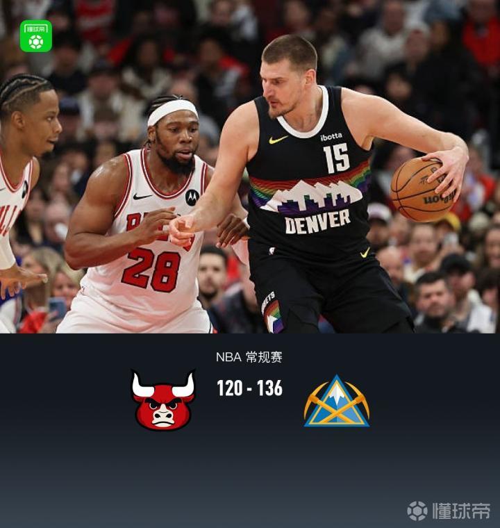 第四节,开节4分钟公牛持续哑火仅有2分入账,掘金在约基奇组织串联下一波20-2直接反超两位数,公牛理查兹、布泽利斯得分止血,掘金瓦兰、穆雷联手回应领先至15分,比赛还剩4分钟,穆雷伤退,公牛无力反扑,末节掘金轰出39-16,全场结束,公牛120-136不敌掘金。