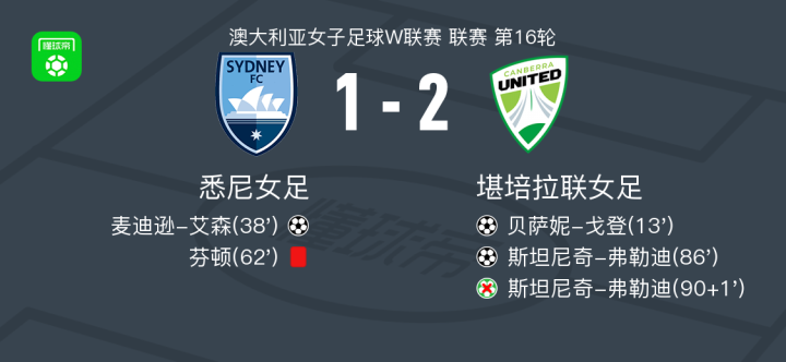 北京时间2月8日澳大利亚女子足球W联赛 联赛 第16轮,悉尼女足主场对阵堪培拉联女足。悉尼女足麦迪逊-艾森破门。堪培拉联女足贝萨妮-戈登破门,斯坦尼奇-弗勒迪破门。最终比分悉尼女足 1-2 堪培拉联女足。