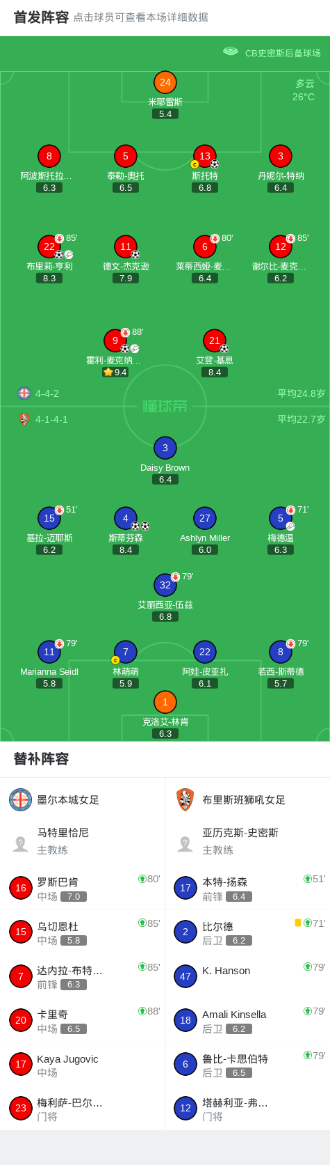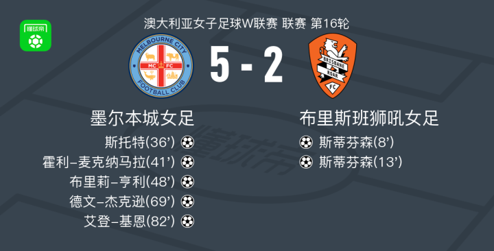 北京时间2月8日澳大利亚女子足球W联赛 联赛 第16轮,墨尔本城女足主场对阵布里斯班狮吼女足。墨尔本城女足斯托特破门,霍利-麦克纳马拉破门,布里莉-亨利破门,德文-杰克逊破门,艾登-基恩破门。布里斯班狮吼女足斯蒂芬森梅开二度。最终比分墨尔本城女足 5-2 布里斯班狮吼女足。