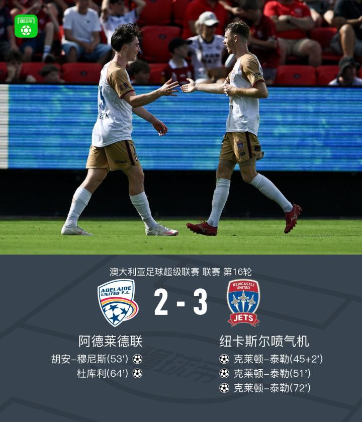 北京时间2月8日澳大利亚足球超级联赛第16轮,阿德莱德联主场对阵纽卡斯尔喷气机,本场比赛主队三度中框。上半场古德温受伤下场,伯基特登场,补时阶段克莱顿-泰勒直接将球传进球门。下半场克莱顿-泰勒破门完成双响,之后卢卡-约万诺维奇破门扳回一球,随后杜库利内切破门扳平比分,之后弗里恩茨失误,泰勒单刀破门成功戴帽。最终纽卡斯尔喷气机3-2战胜阿德莱德联。