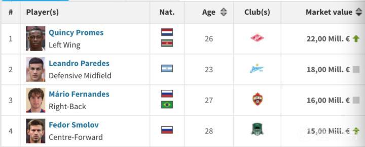 (图:俄超联赛身价榜单)