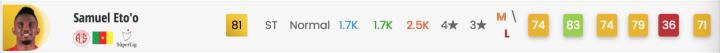 土超总评第一的前锋是大名鼎鼎的埃托奥。但已37岁高龄的他,猎豹速度优势不再。速度属性仅有74。179cm的身高也限制了他的制空能力。