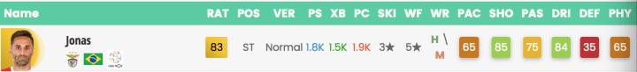 葡超的总评第一中锋是Jonas,速度和身体属性仅有65。作为没有速度优势的前锋,Jonas仅有182cm的身高,制空能力也不十分出色。