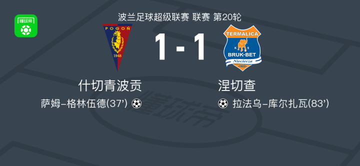 北京时间2月8日波兰足球超级联赛 联赛 第20轮,什切青波贡主场对阵涅切查。什切青波贡萨姆-格林伍德破门。涅切查拉法乌-库尔扎瓦破门。最终比分什切青波贡 1-1 涅切查。