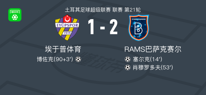 北京时间2月8日土耳其足球超级联赛 联赛 第21轮,埃于普体育主场对阵RAMS巴萨克赛尔。埃于普体育博佐克破门。RAMS巴萨克赛尔塞尔克破门,肖穆罗多夫破门。最终比分埃于普体育 1-2 RAMS巴萨克赛尔。