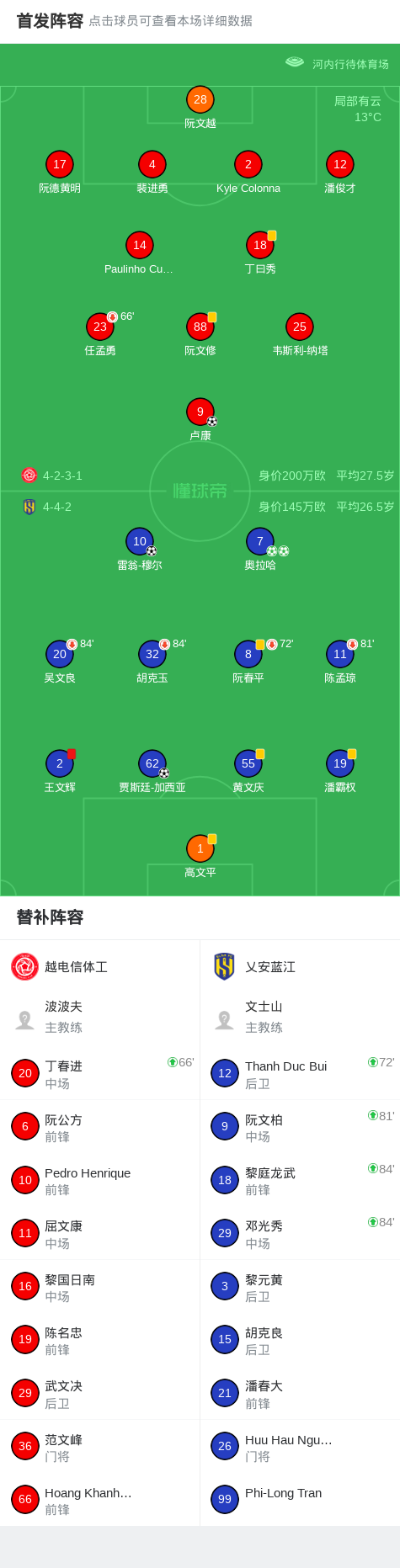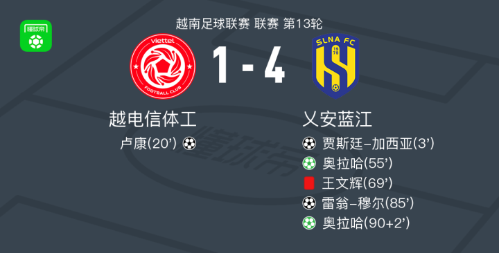 北京时间2月8日越南足球联赛 联赛 第13轮,越电信体工主场对阵乂安蓝江。越电信体工卢康破门。乂安蓝江贾斯廷-加西亚破门,雷翁-穆尔破门,奥拉哈梅开二度。最终比分越电信体工 1-4 乂安蓝江。