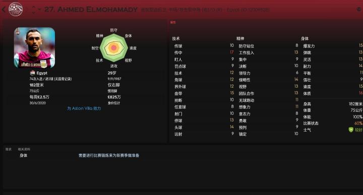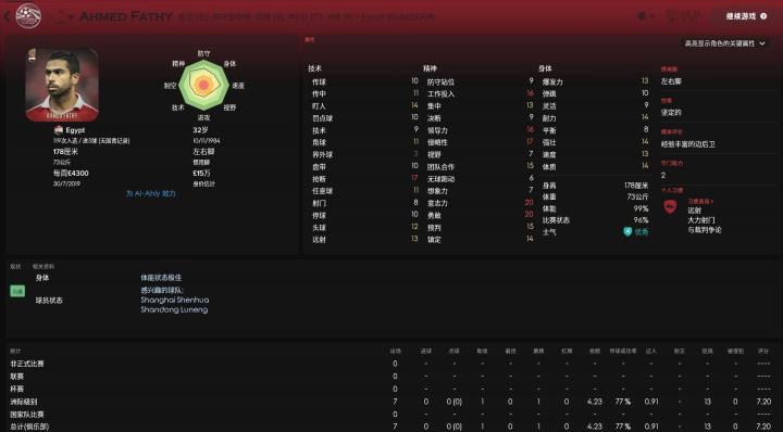 埃及开罗国民队的法特希,也是目前埃及国家队中出场次数最多的球员,司职右后卫,抢断能力出色(17),但毕竟已经33岁了,速度不快(双13),防守站位较差(9),精神属性爆表,意志力20,勇敢20,领导力16,应该属于铁血队长型的精神领袖级球员。