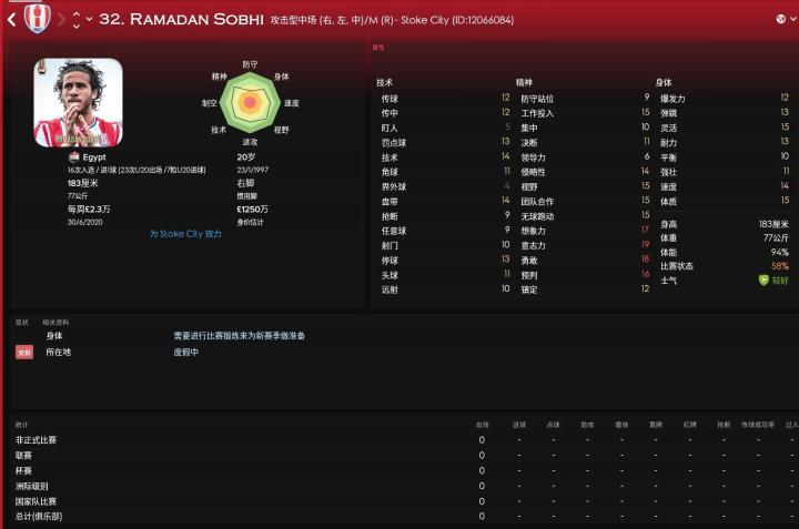 斯托克城的索比,CA134,是埃及能力值第三的球员,不出意外他也应该是萨拉赫在国家队的锋线搭档了,索比非常年轻,97年出生的他只有21岁。他并不是一个射手型球员,更像是一个组织者,有着非常不错的想象力(17)和视野(15),但射门能力很弱(10),速度也不快。虽然年轻,但他精神属性出色,意志力19,勇敢18。萨拉赫身边需要这样一位敢打敢拼的帮手。
