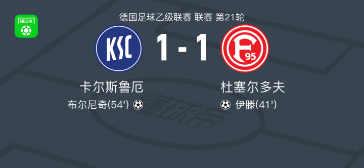 北京时间2月8日德国足球乙级联赛 联赛 第21轮,卡尔斯鲁厄主场对阵杜塞尔多夫。卡尔斯鲁厄布尔尼奇破门。杜塞尔多夫伊滕破门。最终比分卡尔斯鲁厄 1-1 杜塞尔多夫。