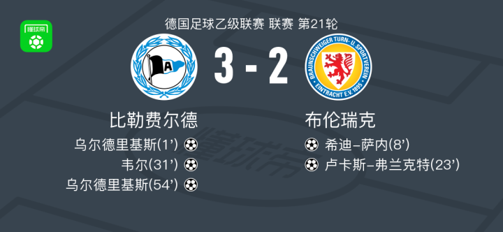 北京时间2月8日德国足球乙级联赛 联赛 第21轮,比勒费尔德主场对阵布伦瑞克。比勒费尔德乌尔德里基斯梅开二度,韦尔破门。布伦瑞克希迪-萨内破门,卢卡斯-弗兰克特破门。最终比分比勒费尔德 3-2 布伦瑞克。