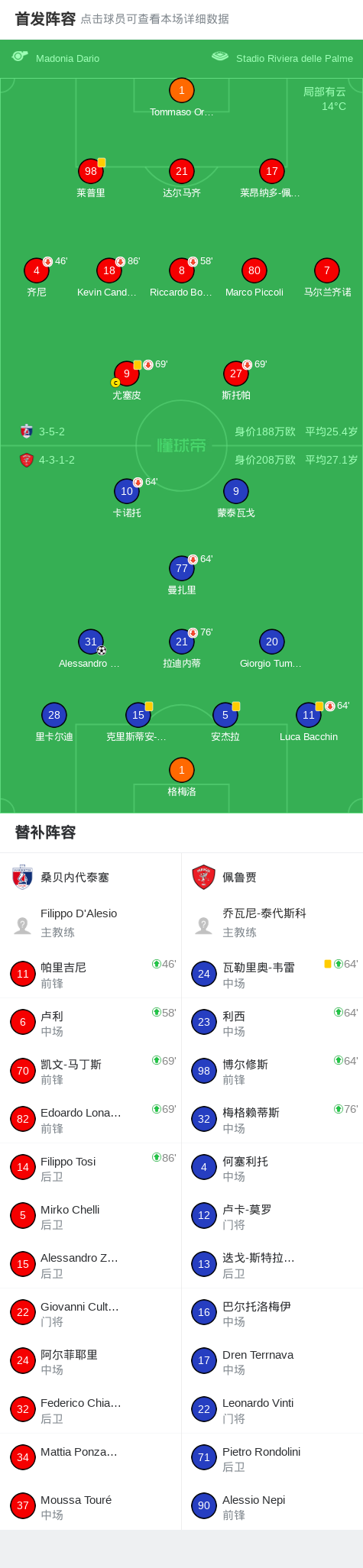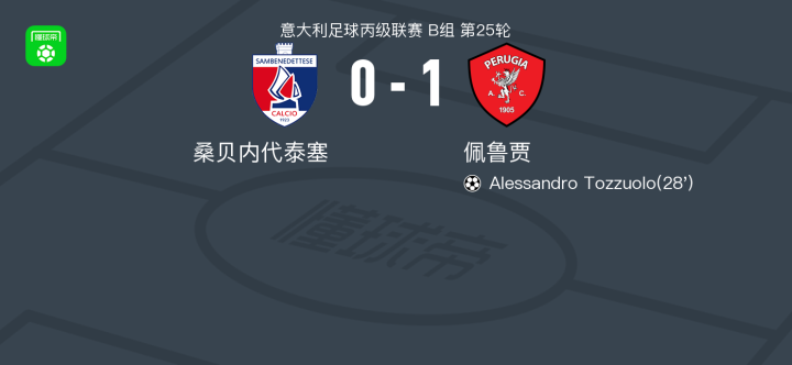 佩鲁贾1-0桑贝内代泰塞,Alessandro Tozzuolo一击制胜战报bot @懂球帝02-08 23:24北京时间2月8日意大利足球丙级联赛 B组 第25轮,桑贝内代泰塞主场对阵佩鲁贾。佩鲁贾Alessandro Tozzuolo破门。最终比分桑贝内代泰塞 0-1 佩鲁贾。点击查看本场比赛详细数据>>点击查看意丙完整积分榜>>精彩瞬间第28分钟,佩鲁贾球员Alessandro Tozzuolo打入一球。 球队阵容 技术统计 展开更多