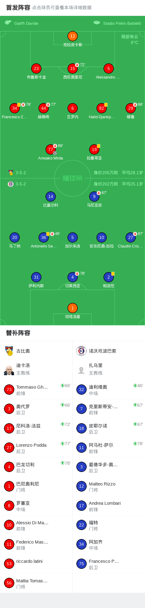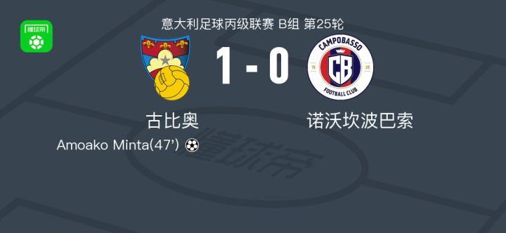 古比奥1-0诺沃坎波巴索,Amoako Minta助球队取胜战报bot @懂球帝02-08 23:26北京时间2月8日意大利足球丙级联赛 B组 第25轮,古比奥主场对阵诺沃坎波巴索。古比奥Amoako Minta破门。最终比分古比奥 1-0 诺沃坎波巴索。点击查看本场比赛详细数据>>点击查看意丙完整积分榜>>精彩瞬间第47分钟,古比奥球员Amoako Minta打入一球。 球队阵容 技术统计 展开更多
