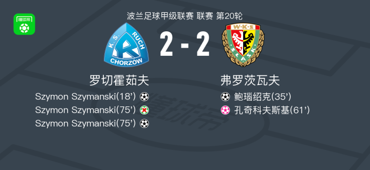 北京时间2月8日波兰足球甲级联赛 联赛 第20轮,罗切霍茹夫主场对阵弗罗茨瓦夫。罗切霍茹夫Szymon Szymanski梅开二度,孔奇科夫斯基自摆乌龙。弗罗茨瓦夫鲍瑙绍克破门。最终比分罗切霍茹夫 2-2 弗罗茨瓦夫。