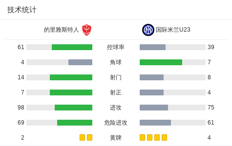 北京时间2月8日意大利足球丙级联赛 A组 第25轮,的里雅斯特人主场对阵国际米兰U23。的里雅斯特人Mattia Tonetto破门,迪尔索梅开二度,Alessandro Faggioli破门。国际米兰U23亚历克西乌破门。最终比分的里雅斯特人 4-1 国际米兰U23。