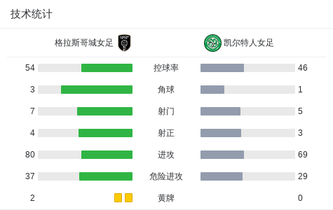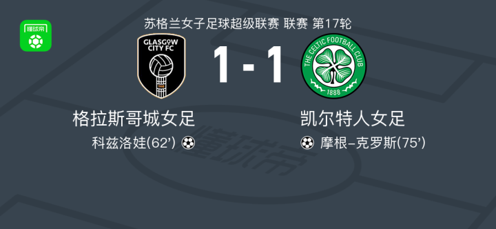 格拉斯哥城女足1-1凯尔特人女足,科兹洛娃首开记录,摩根-克罗斯扳平