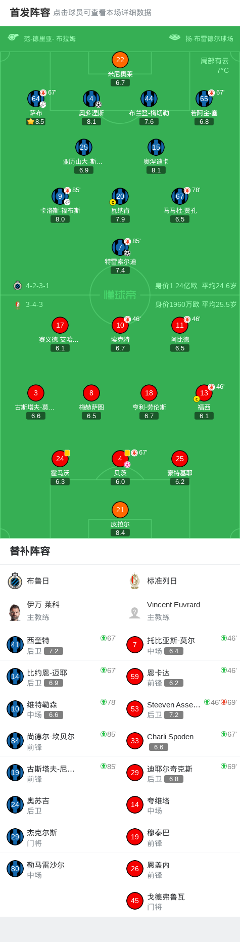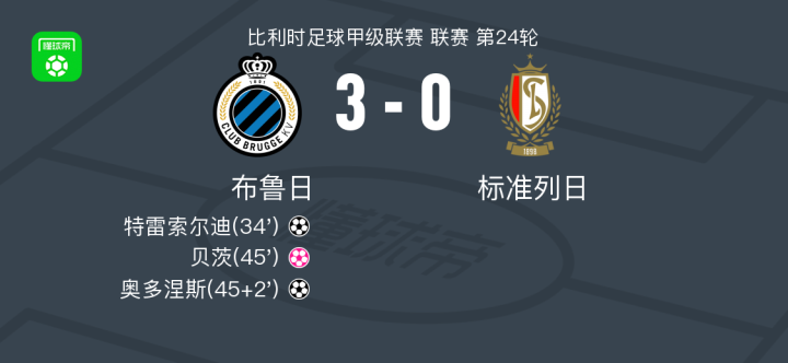 北京时间2月9日比利时足球甲级联赛 联赛 第24轮,布鲁日主场对阵标准列日。布鲁日特雷索尔迪破门,奥多涅斯破门。标准列日贝茨自摆乌龙。最终比分布鲁日 3-0 标准列日。