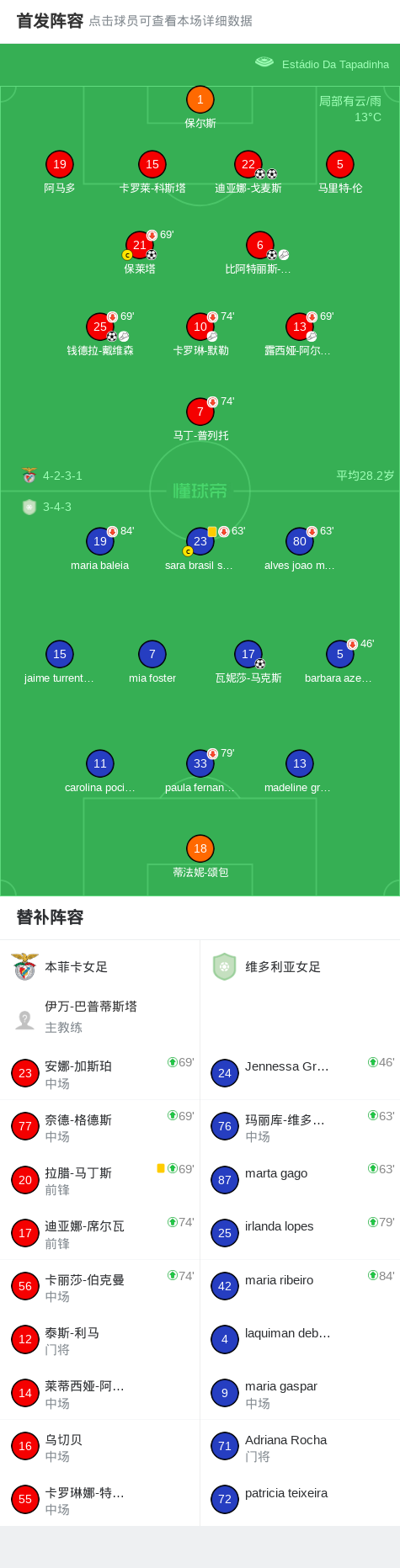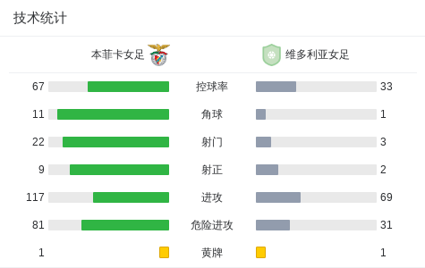 北京时间2月9日葡女锦,本菲卡女足对阵维多利亚女足。本菲卡女足比阿特丽斯-卡梅朗破门,迪亚娜-戈麦斯梅开二度,钱德拉-戴维森破门,保莱塔破门。维多利亚女足瓦妮莎-马克斯破门。最终比分本菲卡女足 5-1 维多利亚女足。