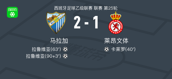 北京时间2月9日西班牙足球乙级联赛 联赛 第25轮,马拉加主场对阵莱昂文体。马拉加拉鲁维亚梅开二度。莱昂文体卡莱罗破门。最终比分马拉加 2-1 莱昂文体。