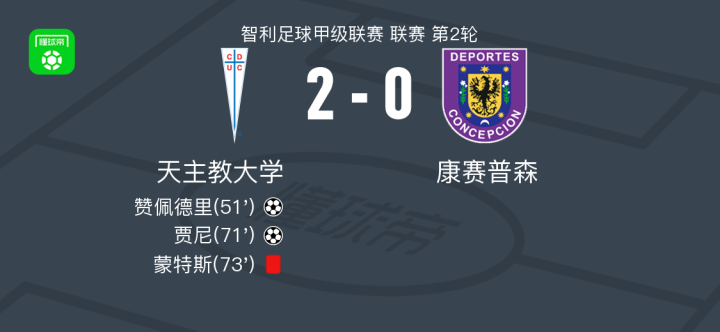 北京时间2月9日智利足球甲级联赛 联赛 第2轮,天主教大学主场对阵康赛普森。天主教大学赞佩德里破门,贾尼破门。最终比分天主教大学 2-0 康赛普森。
