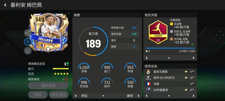 姆巴佩配备了边路超跑天赋,基础花式为高级油炸丸子。实战中,姆巴佩是一名对抗稳定,速度顶级的边锋。盘带方面,姆巴佩的花式衔接流畅,被对手近身干扰时也能持续控制球权即便在高速冲刺中,他也能保持准确的摇杆方向响应。得分方面,姆巴佩的爆射的打门起脚极快,阵地战内切后,他的得分威胁十足。