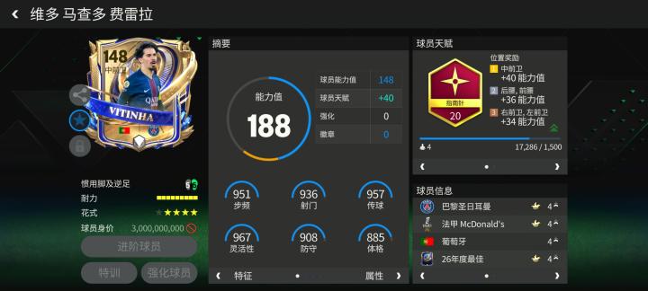维蒂尼亚配备了指南针天赋,基础花式为高级油炸丸子。实战中,实战中,维蒂尼亚的身材依旧偏小,但持球进攻能力更加出色。盘带方面,维蒂尼亚的花式衔接流畅,面对密集防守时也能灵活调整摆脱。反击中,他则可以利用脚后跟磕球快速突破。但在防守端,维蒂尼亚依旧一般,面对大模型的前锋或中场,他在近身对抗中完全处于下风。