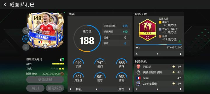 萨利巴配备了叹息之墙天赋,攻守效率中等+高,防守存在感十足。实战中,萨利巴兼备高大的身材和出色的机动性。地面防守中,他的上抢果断,防长传的预判拦截精准。对手接近禁区时,他的上抢以及封堵意识也很不错。进攻端,萨利巴角球进攻得分能力出色,高大的身材搭配准确的落点预判让他的头球极具威胁。