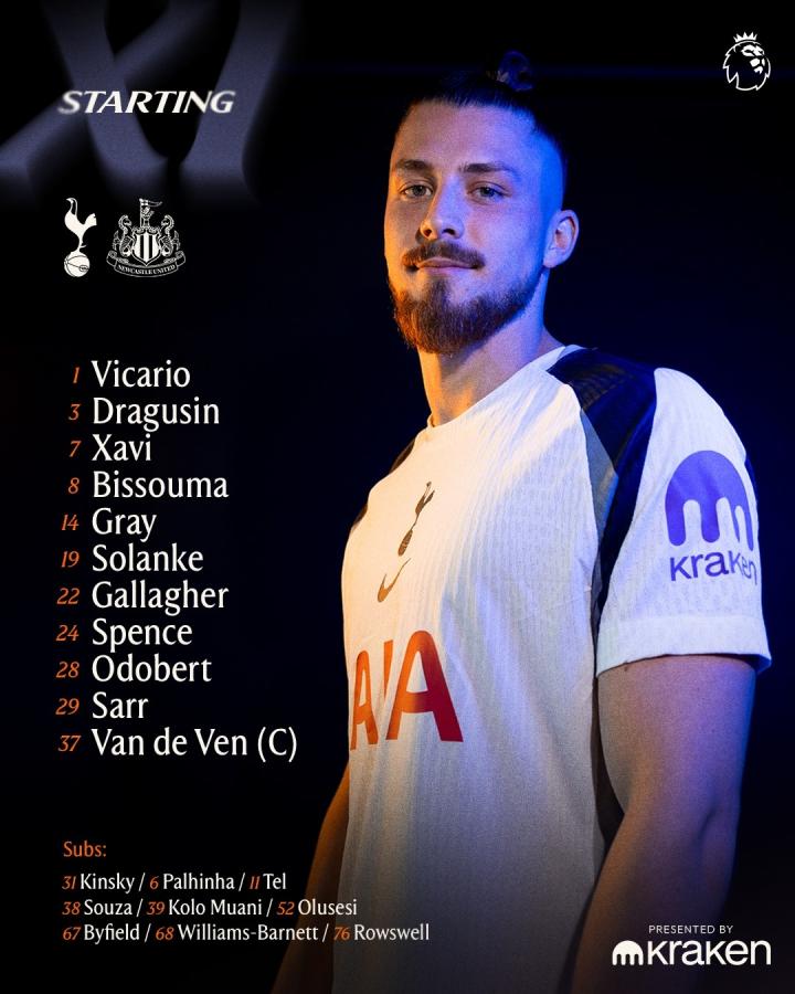 热刺首发:1-维卡里奥、14-阿奇-格雷、3-德拉古辛、37-范德芬、24-斯彭斯、22-加拉格尔、8-比苏马、29-帕普-萨尔、28-奥多贝尔、7-哈维-西蒙斯、19-索兰克