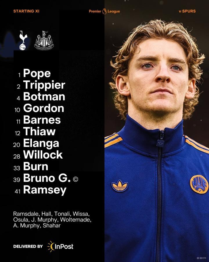 纽卡首发:1-波普、2-特里皮尔、12-佳夫、4-博特曼、33-丹-伯恩、28-威洛克、39-吉马良斯、41-拉姆齐、20-埃兰加、10-安东尼-戈登、11-哈维-巴恩斯