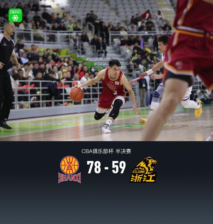 北京时间2月9日CBA俱乐部杯 半决赛,山西汾酒对阵浙江方兴渡。开场广厦取得16-5开局,首节中段孙铭徽便崴脚伤退,随后山西持续保持两位数领先,半场山西50-40广厦,第三节山西一度领先20分,但随后突然哑火广厦一波9-0缩小分差,末节前半段山西再度拉大至19分,最后半节双方直接撤下外援进入练兵时间,最终山西78-59大胜广厦,晋级决赛会师上海。