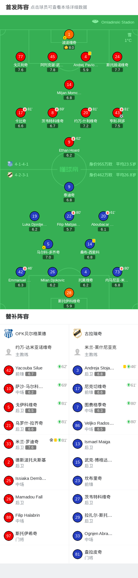 下半场补时第2分钟,OFK贝尔格莱德球员米兰-罗迪奇打入一球。
