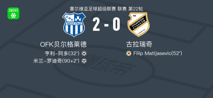 北京时间2月9日塞尔维亚足球超级联赛 联赛 第22轮,OFK贝尔格莱德主场对阵古拉瑞奇。OFK贝尔格莱德亨利-阿多破门,米兰-罗迪奇破门。最终比分OFK贝尔格莱德 2-0 古拉瑞奇。