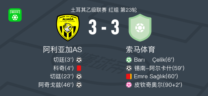 北京时间2月9日土耳其乙级联赛 红组 第23轮,阿利亚加AS主场对阵索马体育。阿利亚加AS切廷梅开二度,阿奇戈兹破门,皮钦奇奥尔自摆乌龙。索马体育Barış Çelik破门,锡南-阿尔卡什破门。最终比分阿利亚加AS 3-3 索马体育。