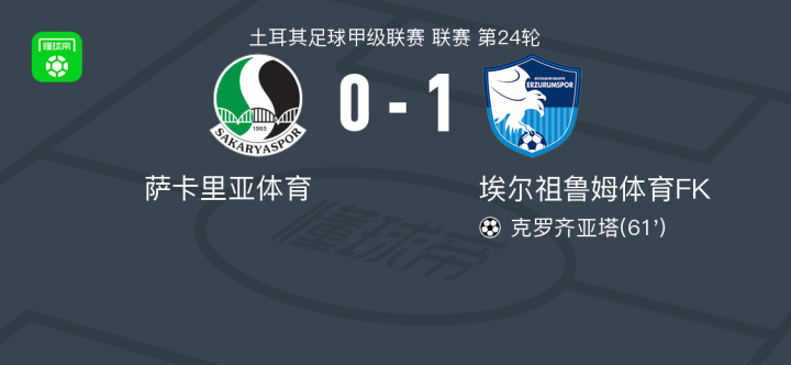 北京时间2月10日土耳其足球甲级联赛 联赛 第24轮,萨卡里亚体育主场对阵埃尔祖鲁姆体育FK。埃尔祖鲁姆体育FK克罗齐亚塔破门。最终比分萨卡里亚体育 0-1 埃尔祖鲁姆体育FK。