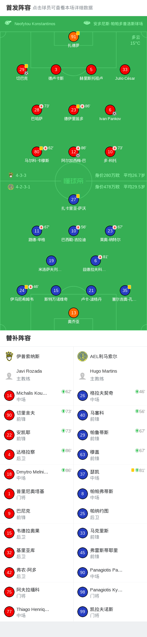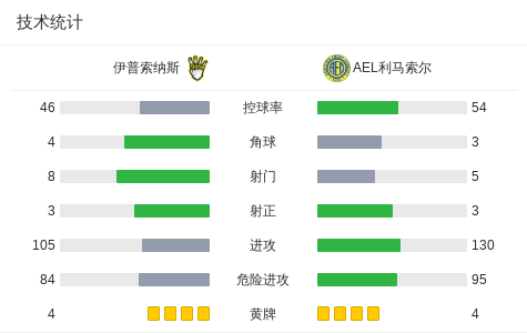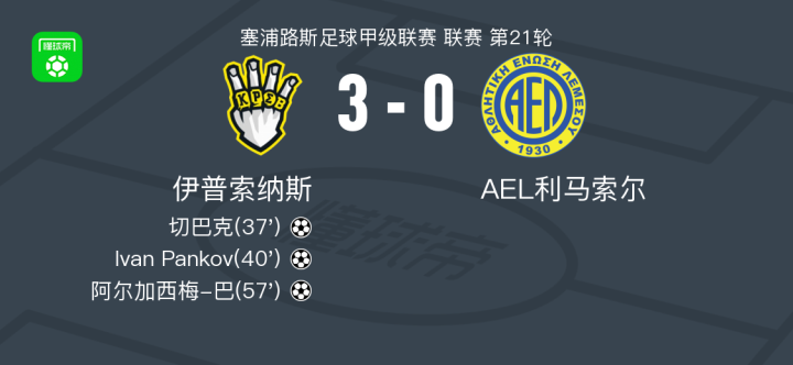 北京时间2月10日塞浦路斯足球甲级联赛 联赛 第21轮,伊普索纳斯主场对阵AEL利马索尔。伊普索纳斯切巴克破门,Ivan Pankov破门,阿尔加西梅-巴破门。最终比分伊普索纳斯 3-0 利马索尔。