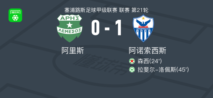 北京时间2月10日塞浦路斯足球甲级联赛 联赛 第21轮,阿里斯主场对阵阿诺索西斯。阿诺索西斯拉斐尔-洛佩斯破门。最终比分阿里斯 0-1 阿诺索西斯。