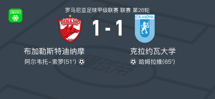 北京时间2月10日罗马尼亚足球甲级联赛 联赛 第26轮,布加勒斯特迪纳摩主场对阵克拉约瓦大学。布加勒斯特迪纳摩阿尔韦托-索罗破门。克拉约瓦大学哈姆拉维破门。最终比分布加勒斯特迪纳摩 1-1 克拉约瓦大学。