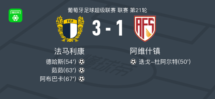 北京时间2月10日葡萄牙足球超级联赛 联赛 第21轮,法马利康主场对阵阿维什镇。法马利康德哈斯破门,茹茹破门,阿布巴卡破门。阿维什镇迭戈-杜阿尔特破门。最终比分法马利康 3-1 阿维什镇。