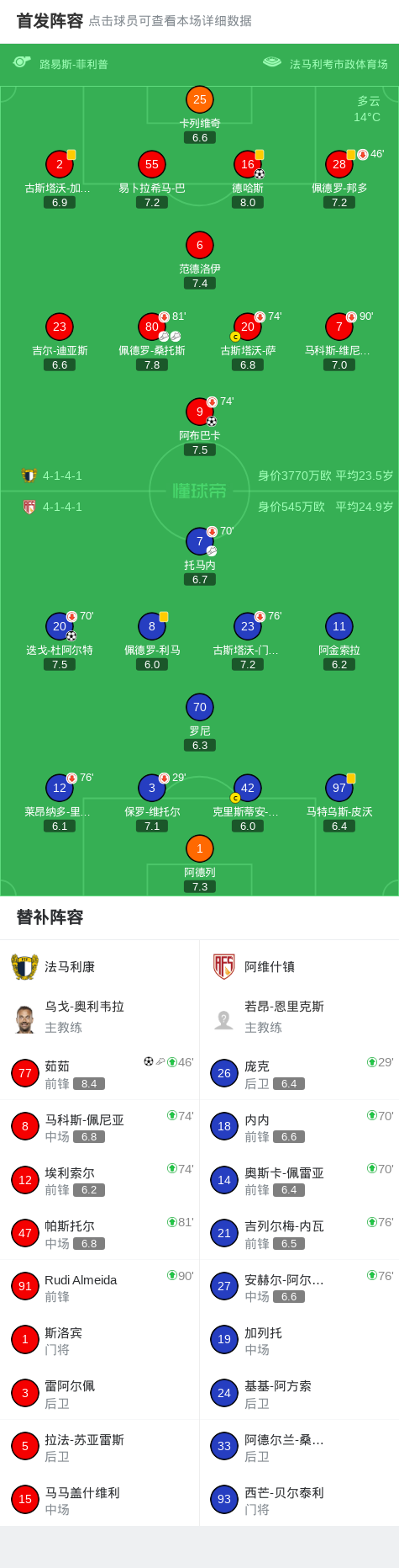 第50分钟,阿维什镇球员托马内助攻迭戈-杜阿尔特打入一球。