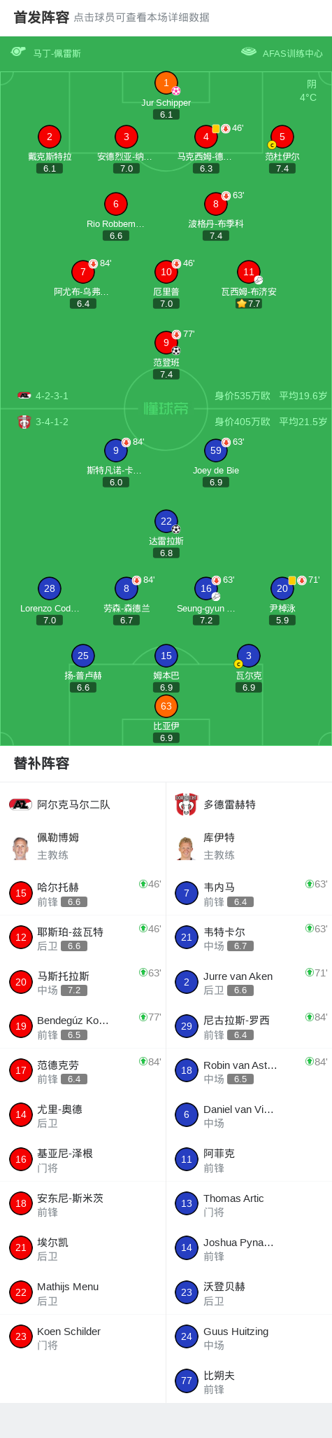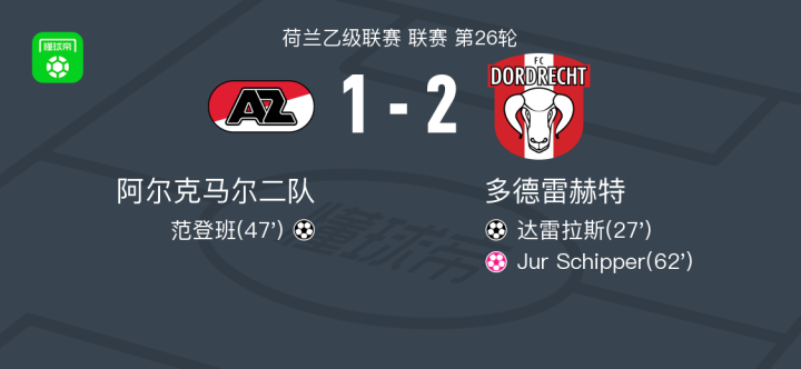 北京时间2月10日荷兰乙级联赛 联赛 第26轮,阿尔克马尔二队主场对阵多德雷赫特。阿尔克马尔二队范登班破门,Jur Schipper自摆乌龙。多德雷赫特达雷拉斯破门。最终比分阿尔克马尔二队 1-2 多德雷赫特。