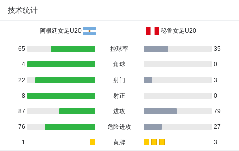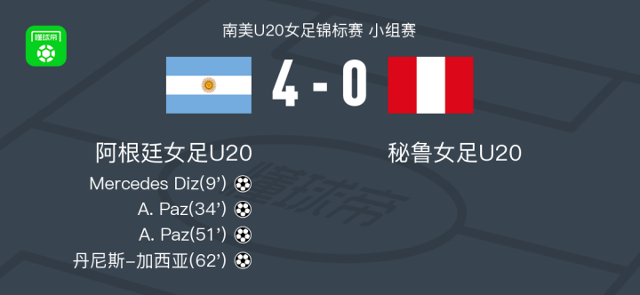 北京时间2月10日南美U20女足锦标赛 小组赛,阿根廷女足U20对阵秘鲁女足U20。阿根廷女足U20Mercedes Diz破门,A. Paz梅开二度,丹尼斯-加西亚破门。最终比分阿根廷女足U20 4-0 秘鲁女足U20。