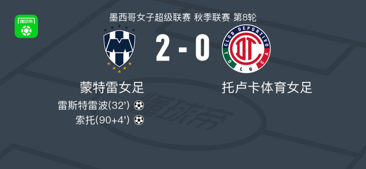 蒙特雷女足2-0托卢卡体育女足取墨女超3连胜,雷斯特雷波建功,索托锦上添花