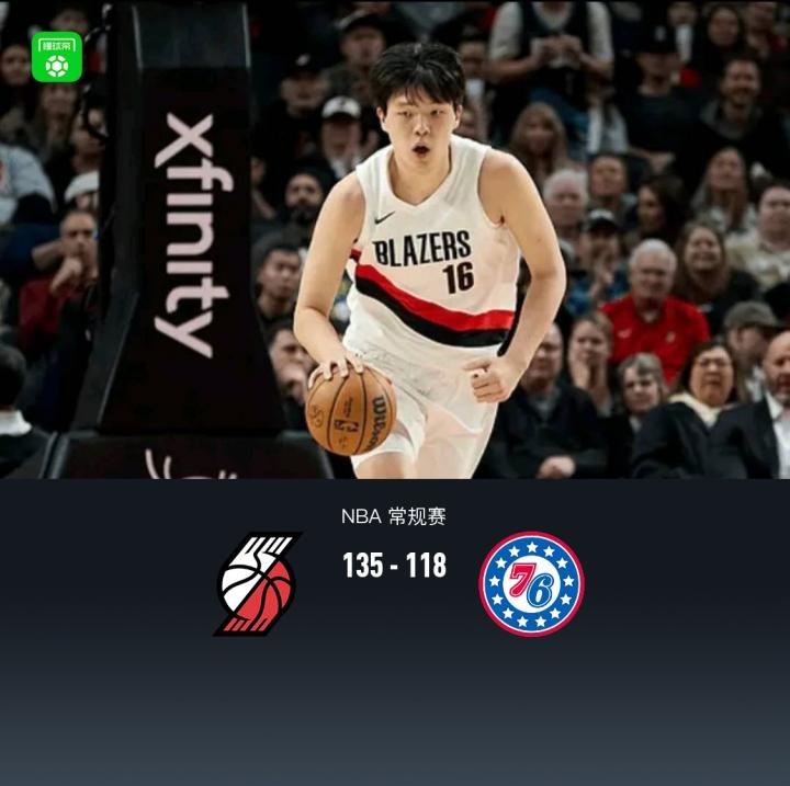 开拓者135-118轻取76人,杨瀚森2分1板1失误2犯规,阿夫迪亚26+10+8