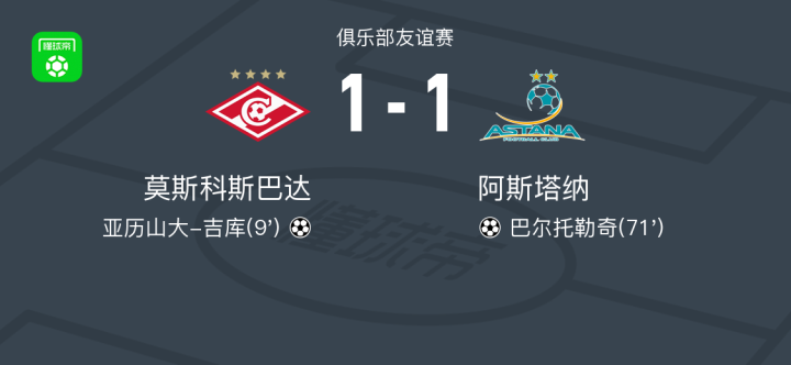 北京时间2月10日俱乐部友谊赛,莫斯科斯巴达对阵阿斯塔纳。莫斯科斯巴达亚历山大-吉库破门。阿斯塔纳巴尔托勒奇破门。最终比分莫斯科斯巴达 1-1 阿斯塔纳。