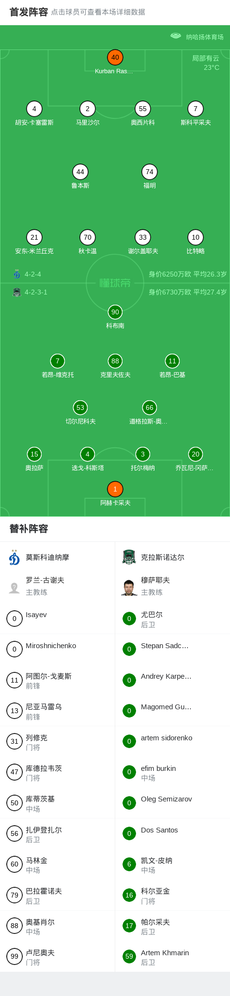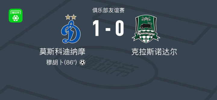 莫斯科迪纳摩1-0克拉斯诺达尔,穆胡卜绝杀战报bot @懂球帝02-10 23:00北京时间2月10日俱乐部友谊赛,莫斯科迪纳摩对阵克拉斯诺达尔。莫斯科迪纳摩穆胡卜破门。最终比分莫斯科迪纳摩 1-0 克拉斯诺达尔。点击查看本场比赛详细数据>>精彩瞬间第86分钟,莫斯科迪纳摩球员穆胡卜打入一球。 球队阵容 技术统计 展开更多