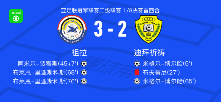 北京时间2月11日亚足联冠军联赛二级联赛 1/8决赛首回合,祖拉对阵迪拜祈祷。祖拉阿米尔-贾穆斯破门,布莱恩-里亚斯科斯梅开二度。迪拜祈祷米格尔-博尔哈梅开二度。最终比分祖拉 3-2 迪拜祈祷。