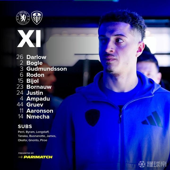利兹联首发:26-达洛、24-贾斯廷、15-比约尔、6-罗顿、3-古德蒙松、23-博尔顿、44-格鲁耶夫、4-阿姆帕杜、2-博格尔、14-恩梅加、11-阿伦森